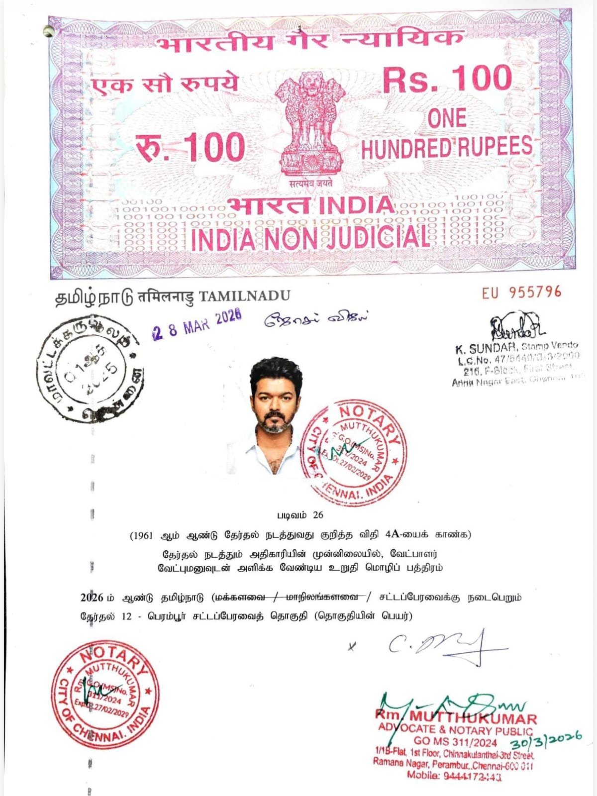 తమిళనాడు రాష్ట్రంలో అసెంబ్లీ ఎన్నికల ఊపు జోరందుకుంది. నామినేషన్ల పర్వం సోమవారం నుంచి మొదలైంది. సినిమా నటుడు విజయ్ కొత్త పార్టీ స్థాపించి ఆ పార్టీ తరపున అభ్యర్థులను బరిలో దింపుతున్న సంగతి తెలిసిందే. ఈ నేపథ్యంలో విజయ్ కూడా నామినేషన్ దాఖలు చేశారు. తన నామినేషన్ పాత్రల్లో 405 కోట్ల రూపాయల చరాస్తులు, 115 కోట్లు విలువ చేసే స్థిరాస్థులు ఉన్నట్టు తన అఫిడవిట్ లో ప్రకటించారు. పెరంబూర్ అసెంబ్లీ నియోజకవర్గానికి నామినేషన్ దాఖలు చేసే క్రమంలో, టీవీకే అధినేత విజయ్ తన అఫిడవిట్లో ₹405 కోట్ల చరాస్తులు, ₹115 కోట్ల స్థిరాస్తులు ఉన్నట్లు వెల్లడించారు.